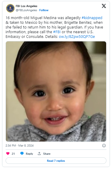 El Buró Federal de Investigaciones (FBI, por sus siglas en inglés) compartió una ficha de búsqueda para dar con el paradero del menor estadounidense Miguel Medina – de 1 año y 4 meses de edad -, quien presuntamente fue secuestrado por su madre Brigette Benítez. Según las investigaciones de las autoridades, el pequeño y su progenitora podrían estar escondidos en el estado de Aguascalientes, en México.