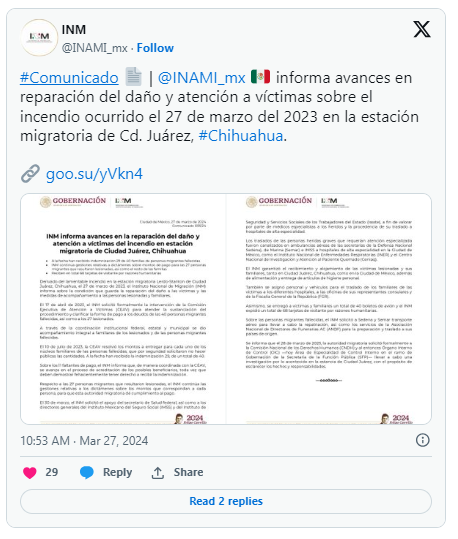 “El 10 de julio de 2023, la CEAV resolvió los montos a entregar para cada uno de los núcleos familiares de las personas fallecidas, que por seguridad solicitaron no hacer públicas las cantidades. A la fecha han recibido la indemnización 29, de un total de 40. Sobre los 11 faltantes de pago, el INM informa que, de manera coordinada con la CEAV, se avanza en el proceso de acreditación de los posibles beneficiarios, toda vez que deben demostrar fehacientemente tener derecho a recibir la indemnización”, puntualizó.