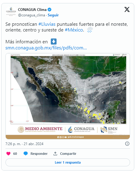 Durante el periodo de pronóstico del organismo de la Conagua, se prevé ambiente caluroso a muy caluroso sobre la mayor parte del territorio nacional, con temperaturas superiores a 40 °C en zonas de Sonora, Sinaloa, Nayarit, Jalisco, Colima, Michoacán, Guerrero, Oaxaca, Chiapas, Nuevo León, Tamaulipas, San Luis Potosí, Morelos, Veracruz, Tabasco, Campeche y Yucatán.