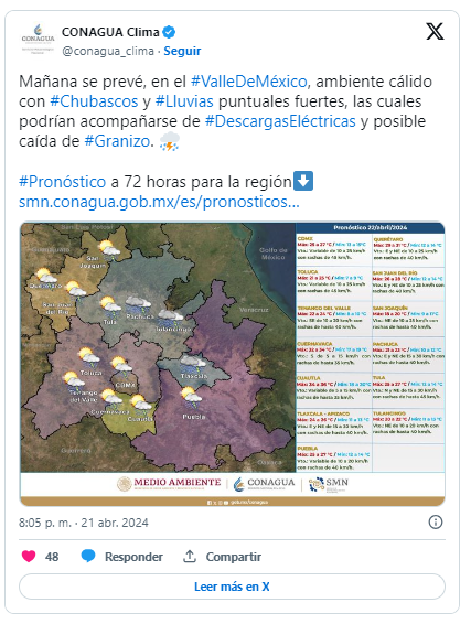 En el Valle de México se pronostica al amanecer cielo medio nublado, ambiente fresco a templado y brumoso, así como bancos de niebla y posibles lloviznas en zonas altas. Durante la tarde, cielo nublado, ambiente cálido con chubascos y lluvias puntuales fuertes en la Ciudad de México y en el Estado de México, las cuales podrían acompañarse de descargas eléctricas y posible caída de granizo. La temperatura mínima pronosticada para la Ciudad de México es de 13 a 15 °C y una máxima de 25 a 27 grados.